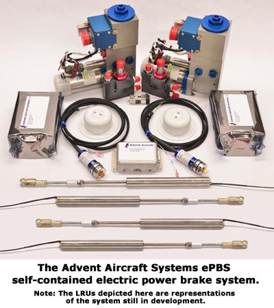 Advent Aircraft Systems has unveiled its concept for a new self-contained electric power brake system, a follow-up to the company's eABS anti-skid braking system. The Advent Electric Power Braking System (ePBS™) would be aimed at new all-electric aircraft designs, new aircraft with traditional hydraulics but desiring an electric braking system, or as a retrofit for existing aircraft.